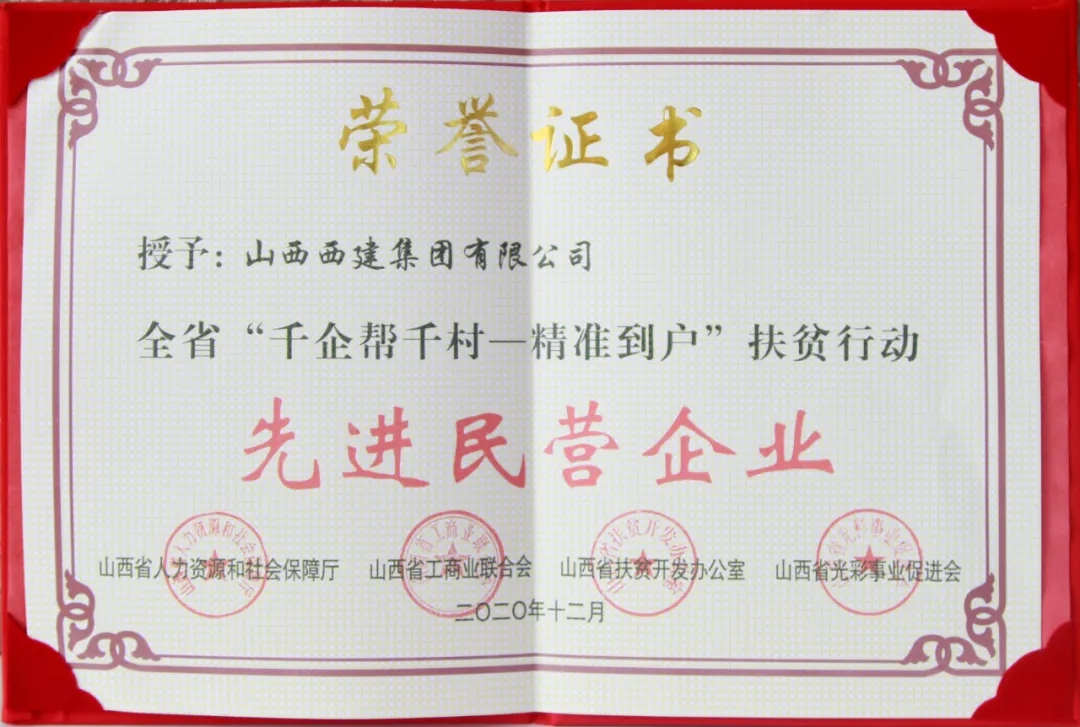 12月10日,在太原召開的山西省工商聯(總商會)十二屆七次常委會議暨全省“千企幫千村——精準到戶”扶貧行動先進民營企業表彰大會上,山西西建集團榮獲“千企幫千村——精準到戶”扶貧行動先進民營企業榮譽稱號。