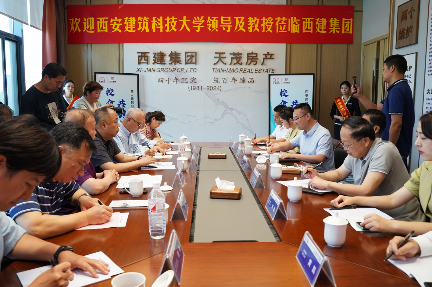 2024年3月份,西建集團天茂房產總經理劉忠森,向母校西安建筑科技大學“紅燭”基金捐款10萬元。為了表達對校友的感謝,及共促校企合作新征程。2024年5月30日,西安建筑科技大學副校長董群雁一行深入走訪校友劉忠森企業西建集團。西安建大老教授協會會長王齊銘,西安建大離退休辦公室主任樊宏斌,西安建大管理學院黨委副書記、副院長周琳,西安建大退休辦黨委副書記張俏,西安建大教育基金管理部部長張廣敏,西安建大老教授協會秘書長趙安啟,西安建大離退休辦公室主任、離休科科長陳琳,西安建大老教授協會劉炳南教授,西安建大老年大學高鑫等領導,及教授隨同調研。原運城市委常委、人大常委會副主任王正風,運城市住建局副局長郭強,西建集團天茂房產總經理劉忠森接待陪同。
