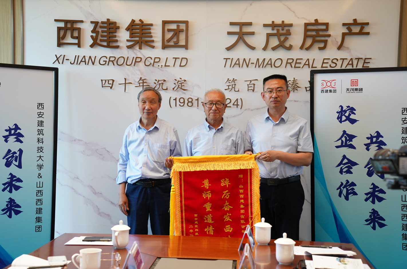 西安建大老教授協會會長王齊銘、西安建大老教授協會秘書長趙安啟為西建集團送予錦旗