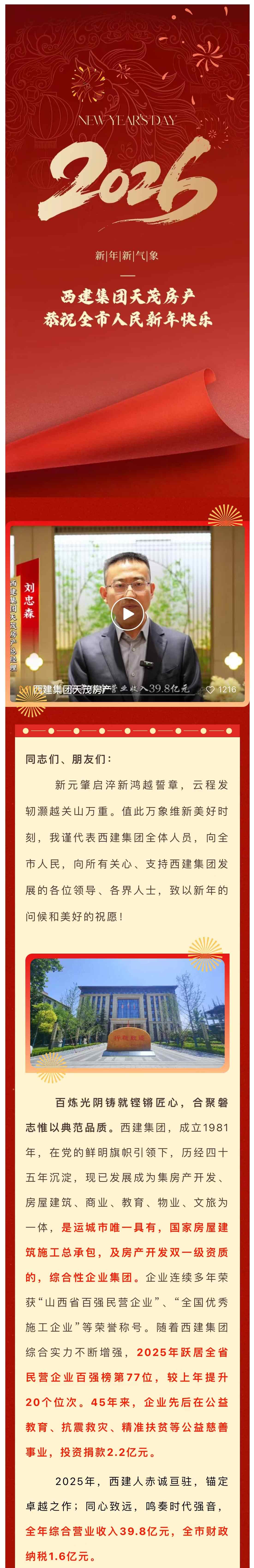 西建集團劉忠森發表二0二六年新年賀詞